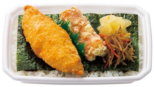 ほっともっとの定番ですね。ふっくら炊き上がったごはんの上に、おかか昆布と風味豊かな国産のりをしいて、ちくわの天ぷらと、白身フライをのせています。