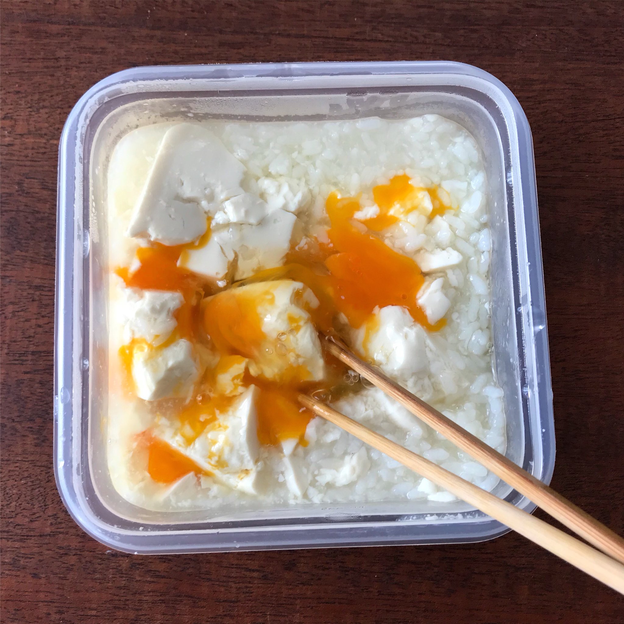 - 豆腐を耐熱容器に入れ崩し、卵を入れかき混ぜる。