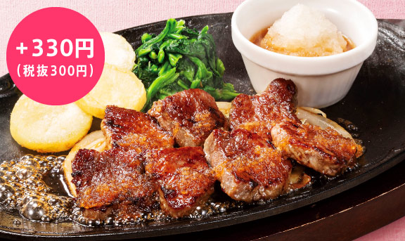 | カットステーキ[約130g]~選べるソース(ライスつき)ソース除く | 509 | 27.9 | 10.2 | 79.3 | 74.7 | 2.8 |