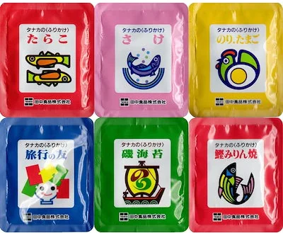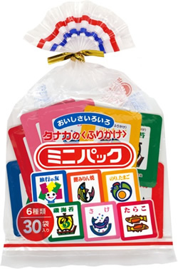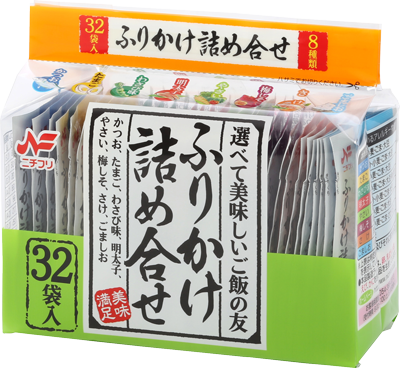 「かつお」「たまご」「わさび味」「明太子」「やさい」「梅しそ」「さけ」「ごましお」の8種類の味の詰合せです。